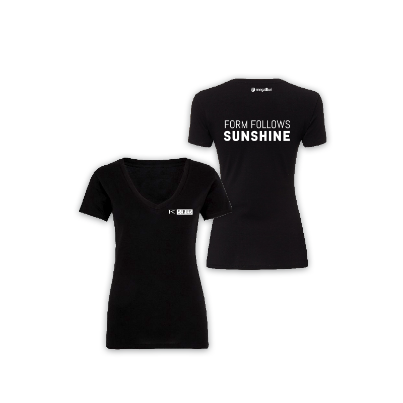 Damenshirt V-Neck, schwarz, inkl. Front-und Rückendruck: "K-Serie" und "Form follows sunshine"
