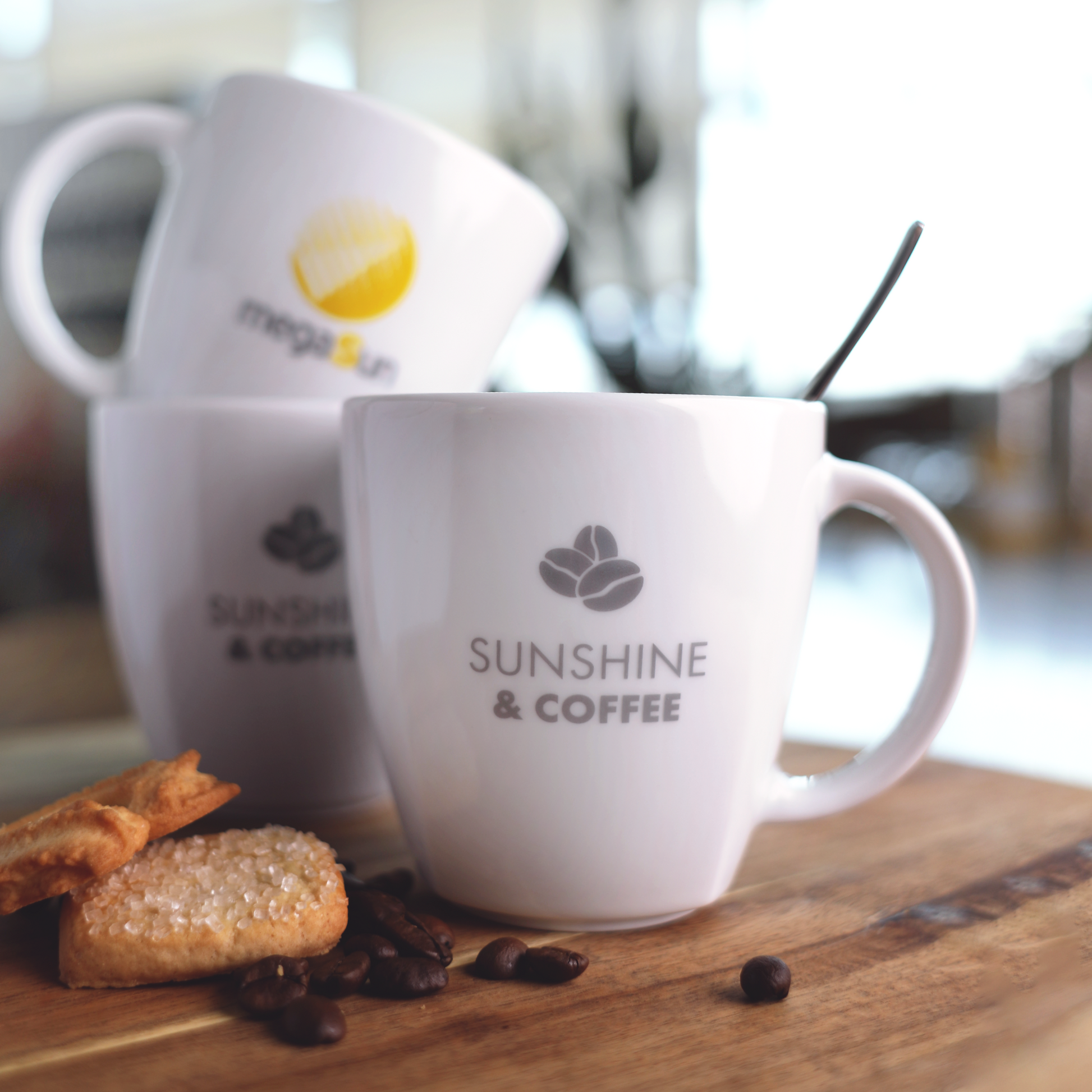 Kaffeetasse mit Aufdruck. Vorderseite megaSun | Rückseite Sunshine & Coffee.